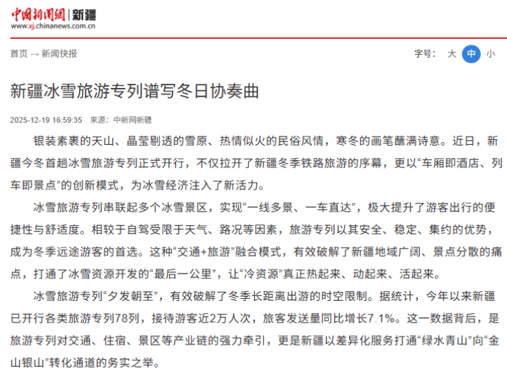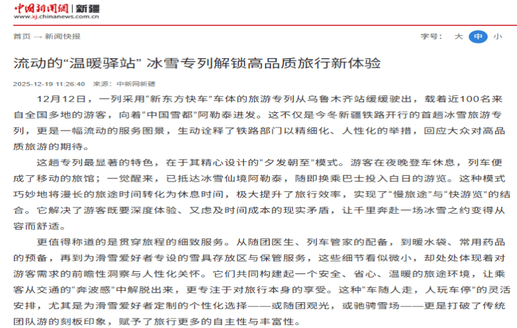 12月19日,中国新闻网刊发孙雄撰写的网评《新疆冰雪旅游专列谱写冬日协奏曲》。