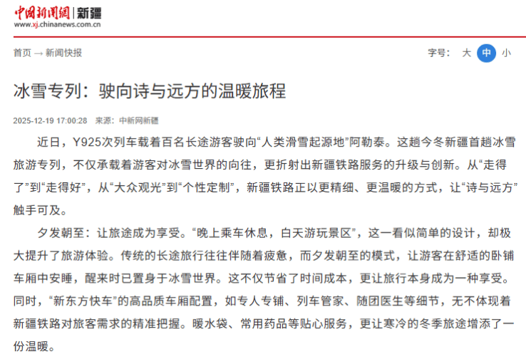 12月26日,《新华每日电讯》刊发《南疆慢车行》,以记者乘车亲历为视角,聚焦往返和田至乌鲁木齐的7558次公益性 “慢火车”,讲述它如何成为南疆民生与发展的纽带,见证并推动当地从交通、生活到观念的巨变,凸显国家 “不落下一个人” 的民生承诺。