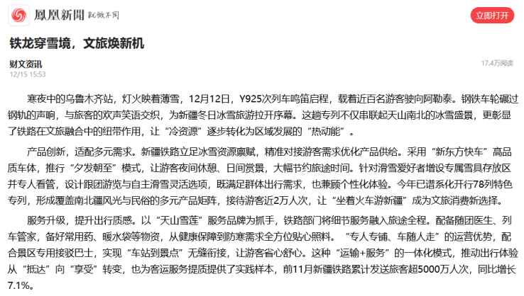 12月15日,凤凰新闻网刊发衡鑫钰、刘叶枫撰写的网评《铁龙穿雪境,文旅焕新机》。
