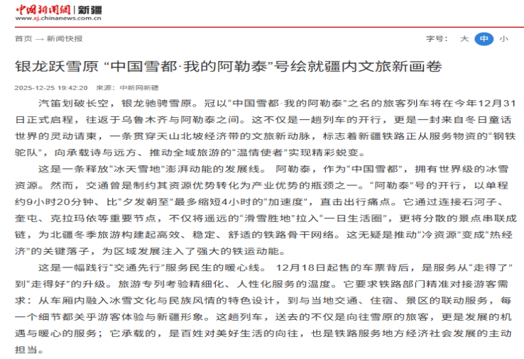 12月25日,中国新闻网刊发张阳灿撰写的网评《银龙跃雪原 “中国雪都·我的阿勒泰”号绘就疆内文旅新画卷》。
