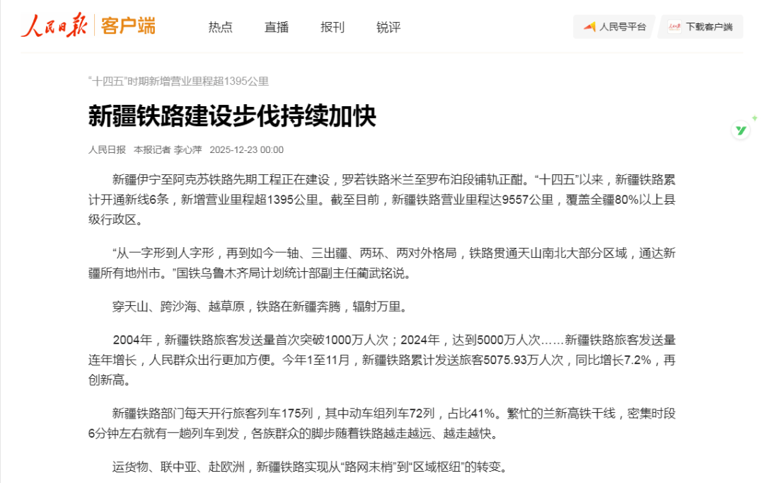 12月23日,人民日报、人民日报客户端刊发《“十四五”时期新增营业里程超1395公里 新疆铁路建设步伐持续加快》,报道了新疆伊宁至阿克苏铁路先期工程正在建设,罗若铁路米兰至罗布泊段铺轨正酣。“十四五”以来,新疆铁路累计开通新线公里。截至目前,新疆铁路营业里程达9557公里,覆盖全疆80%以上县级行政区。